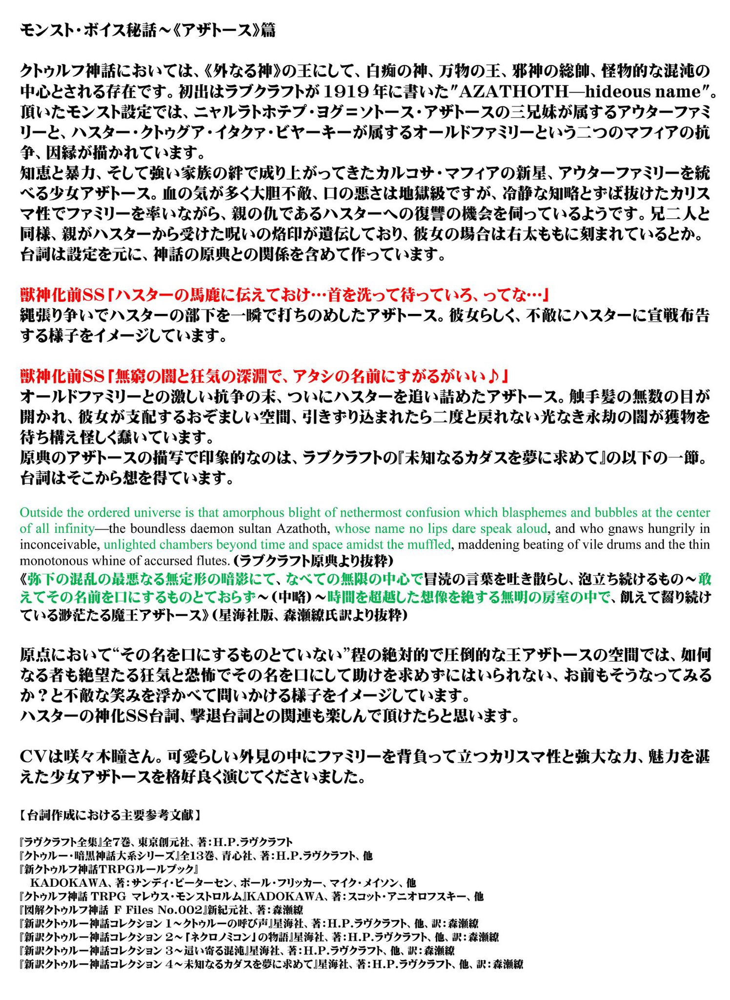 桑原理一郎 No Twitter クトゥルフ神話で 外なる神 の王とされる アザトース の台詞は 設定を元に 原典との関係も含めて作っています Cvは 咲々木瞳 さん 可愛らしい外見の中にファミリーを背負って立つカリスマ性と強大な力 魅力を湛えた少女アザトースを